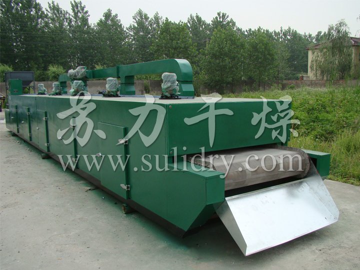 物料由加料器均勻地鋪在網(wǎng)帶上,網(wǎng)帶一般采用12-60目不銹鋼絲網(wǎng),由傳動(dòng)裝置拖動(dòng)在干燥機(jī)內(nèi)移動(dòng)。干燥機(jī)由若干單元組成,每一單元熱風(fēng)獨(dú)立循環(huán),部分尾氣由專門排濕風(fēng)機(jī)排出,廢氣由調(diào)節(jié)閥控制,熱氣由下往上或由上往下穿過鋪滿物料的網(wǎng)帶完成熱量與質(zhì)量傳遞的進(jìn)程,帶走物料水份。網(wǎng)帶緩慢移動(dòng),運(yùn)行速度可根據(jù)物料溫度自由調(diào)節(jié),干燥后的成品連續(xù)落入收料器中。上下循環(huán)單元根據(jù)用戶需要可靈活配備,單元數(shù)量亦可根據(jù)需要選取。